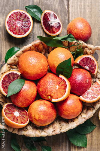 Whole and sliced blood oranges in a basket on wooden table background. Close up, flat lay