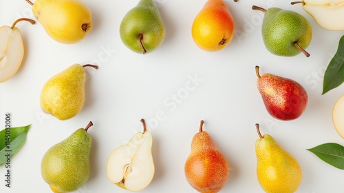 Whole and sliced nectarines with green leaves arranged in a circle on a white background, minimalistic and clean design, isolated with copy space for text, vibrant organic produce, juicy and healthy f