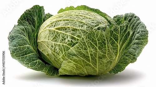 Whole Cabbage with Subtle Leaf Texture Fully Visible on White Background