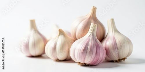 Whole fresh garlic bulbs, papery skin, white background, flavor, texture