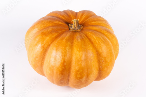 Whole fresh orange big pumpkin on white background, closeup. Organic agricultural product, ingredients for cooking, healthy food vegan.