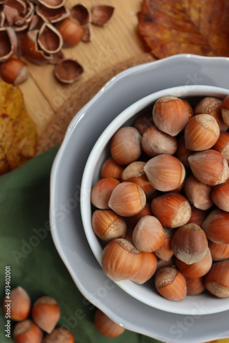 Whole hazenuts in a bowl with cracked hazenuts and autumnal leaves on wooden background