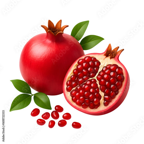 Whole pomegranate half pomegranate seeds and leaves on black background