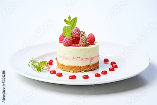 whole raspberry cheesecake with mint garnish on white plate