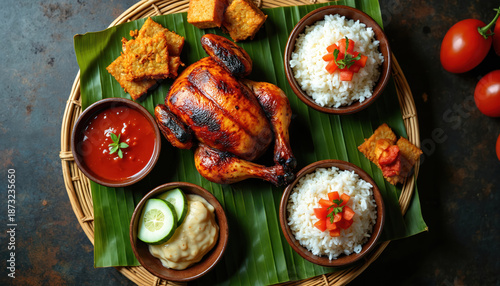 Whole roasted chicken served with rice, fried tempeh, sauce, and cucumber salad on banana leaf. Delicious asian meal prepared for lunch or dinner. Savory dish perfect for family gatherings.