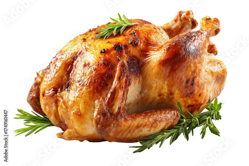Whole roasted chicken with crispy golden brown skin garnished with rosemary sprigs bird poultry, Isolated On Transparent Background, Png Cut Out