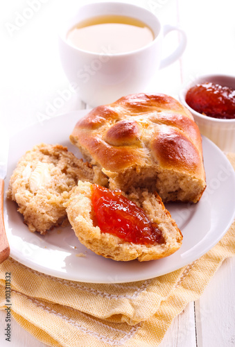 baked, bread, breakfast, brunch, bun, butter, drink, healthy, homemade, jam, marmalade, pastry, snack, tea, treat, wheaten, wheaten