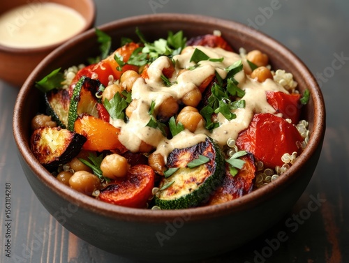 Wholesome quinoa salad with roasted vegetables and tahini dressing in a rustic bowl