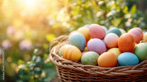 Wicker Basket Filled with Colorful Easter Eggs in a Sunny Garden Setting Close Up Macro Shot Holiday Celebration Springtime