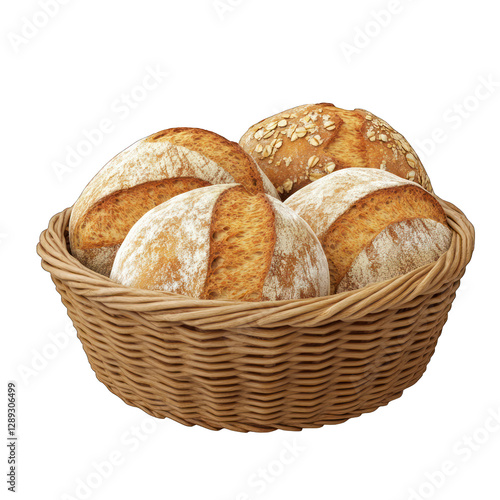 basket, bread, round, artisanal, isolated, white background, wicker, fresh, baked, rustic, homemade, gold, crusty, food, traditional, organic, bakery, flour, wheat, loaf, crunchy, natural, healthy, whole grain