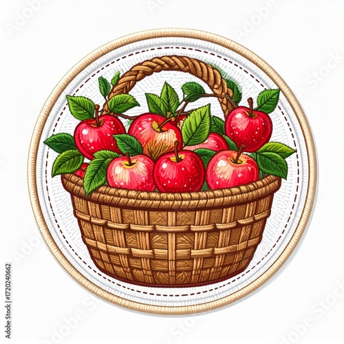 apple, basket, fruit, red, food, healthy, green, fresh, leaf, organic, harvest, nature, delicious, sweet, nourishment, autumn, ripe, natural, raw, vegetarian, ingredient, plant, wooden, woven, full, rustic, isolated, background, closeup, still, life, round, border, illustration, drawing, clip art, design, element, artwork, hand