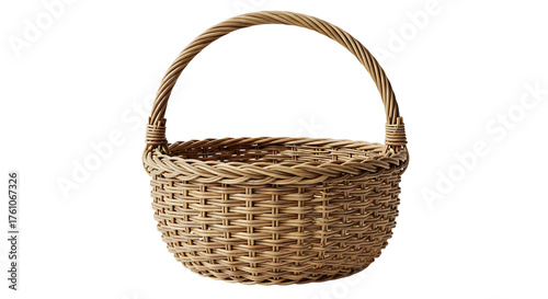 basket, wicker, handle, container, storage, craft, hand-made, natural, material, woven, round, empty, traditional, rustic, kitchen, picnic, decoration, object, accessory, utility, brown, light, simple, clean, studio, shot, product, display, home, decor