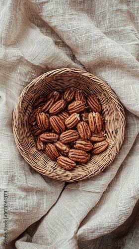 nut, pecan, bowl, wicker, basket, linen, clothes, food, healthy, snack, brown, light, beige, top, view, studio, still, life, close, image, overhead, natural, texture, photo, organic, raw, whole, kernel, shelled, delicious, autumn, harvest, autumn, fall, warm, tone, detail, surface, simple