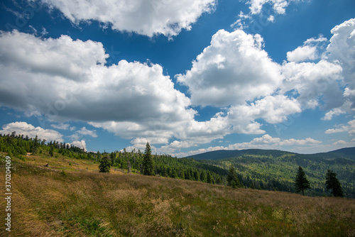Wide angle view from the top of the mountain in Harghita Madaras , Transylvania, Romania, blue sky with white clouds background.