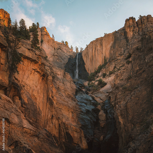 Wide Angle View of Craggy Cliffs and Sheer Rock Waterfall