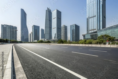 Wide asphalt road stretching through a modern cityscape with sleek skyscrapers and glass towers in the background, city streets, urban development, urban sprawl
