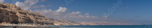 Wide coastal panorama along Mirbat–Hasik Road, Oman: rugged limestone cliffs meeting turquoise Arabian Sea under a clear blue sky with scattered clouds.