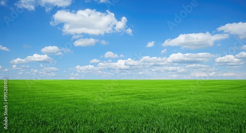 Wide emerald turf field under a clear blue sky highlighted by white clouds and copy space for text