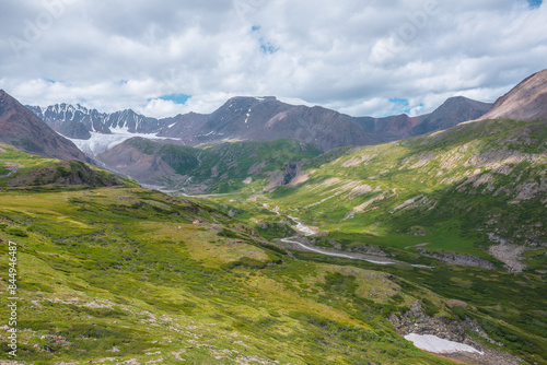 Wide green alpine valley with snake river among hills and rocks with vast view to large snow mountain top and big glacier tongue under cloudy sky. Serpentine river in high mountains. Shadows of clouds
