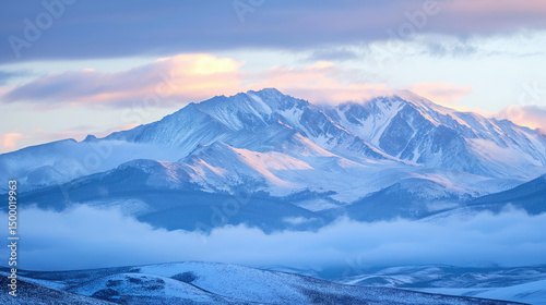mountain, snow, winter, landscape, cloud, fog, peak, sky, horizon, nature, range, travel, vista, scene, terrain, cold, ice, ridge, hill, vale, environment, atmosphere, wilderness, adventure, elevation, light, dawn, dusk, sunrise, sunset, weather, background, geography, panorama, season, freeze, slope, summit, geology, rock, formation, altitude, climate, frost, hiking, outdoors, exploration, view, ski