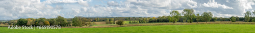Wide panorama of beautiful Cotswold landscape on a sunny autumn day with a long vista. English countryside