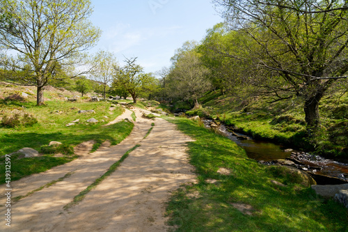 Wide rutted footpath running alongside Burbage Brook in Derbyshire