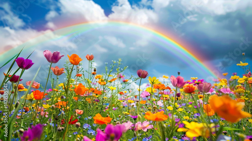 rainbow, flower field, colourful, nature, beauty, scenic, arching, poppy, field, flower, red, summer, meadow, spring, flower, poppy, grass, garden, sky, bloom, blossom, plant, landscape, blue, tulip, sun, countryside, colours, beautiful, season