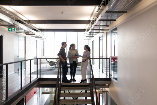 Wide shot of three office workers standing at the top of the stairs