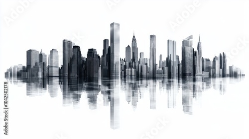 Wide-angle panorama of urban business district with towering buildings, isolated on white background