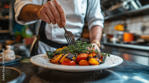 Wide-angle shot of a chef plating a beautifully arranged plate of grilled vegetables with fresh thyme, the kitchen bustling with activity in the background