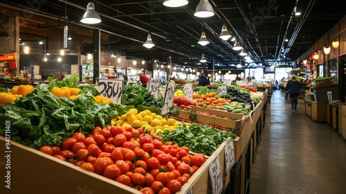 Wide-angle view of a lively indoor market hall. Fresh produce in abundance, from leafy greens to ripe tomatoes,