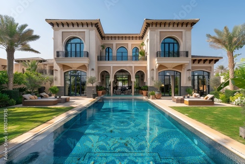 Wide-angle view of a stunning pool and outdoor area featuring a large flat garden with lawn and seating spaces, set against an Arab-style villa.