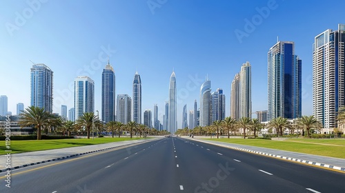 Wide-angle view of an empty urban street surrounded by skyscrapers, with ample negative space in the clear blue sky for creative design use