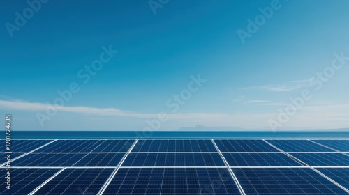 Wide-Angle View of Solar Panels Under Bright Sky and Calm Ocean Horizon During Daylight Hours