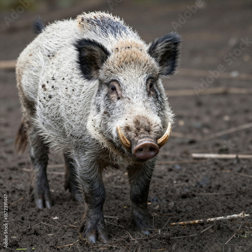 wild boar, boar, mammal, wildlife, tusk, muddy, standing, front view, ear, eye, snout, outdoors