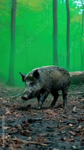 wild boar, forest, green, nature, animal, wildlife, mammal, pig, boar, timberland, tree, leaf, ground, dirt, dark, moody, mystical, enigmatic, atmospheric, serene, tranquil, calm, peaceful, solitary, alone, wild, untamed, natural, organic, environment, ecology, ecosystem, habitat, fauna, flora, beast, creature, mammalian, hog, swine, forest floor, underbrush, green leaf, shadow, light, depth of field, sharpened