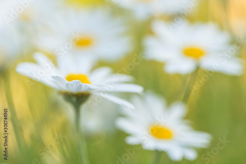 Wild chamomile in the field. Chamomile plant Matricaria Chamomilla. Matricaria chamomilla flowers on meadow, selective focus.