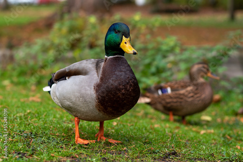 wild duck drake stands on green grass