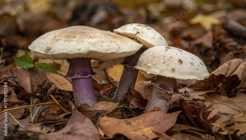 Wild edible mushroom amidst fallen leaves, foraging in autumn forest, seasonal change