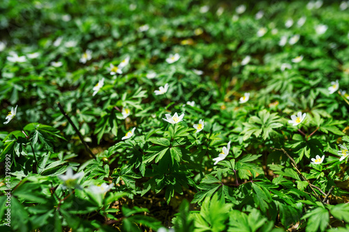 flower, anemone, spring, small, lawn, forest, meadow, green, fresh, white, group, floral, natural, wild, field, nature, grass, background, blossom, primrose, beautiful, garden, uncultivated, bloom, plant, season, sunny, harmony, rural, seasonal, beauty, grow, wood, botany, flora, scenic, environment, ecology, herb, blooming, springtime, tranquil, purity