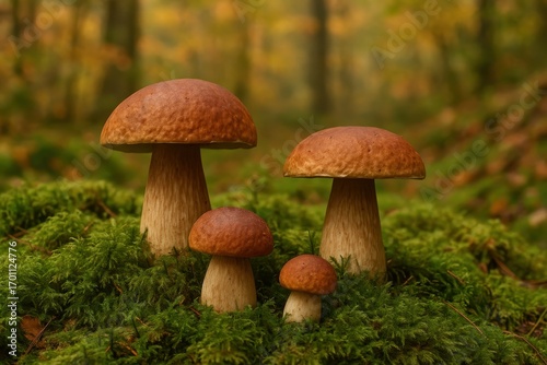 Wild forest mushrooms with moss carpet and autumn foraging atmosphere for nature education themes