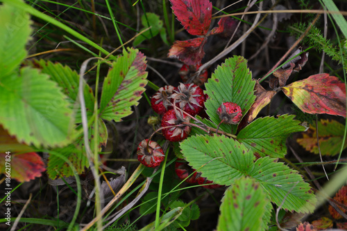 Wild ripe Strawberries Growing in Lush Green Foliage top view