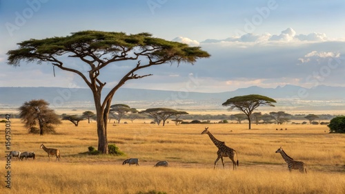 wildebeest in serengeti national park, African landscape. Zebra and wildebeests grazing in a grass of african savannah. Mara national Reserve, Kenya.