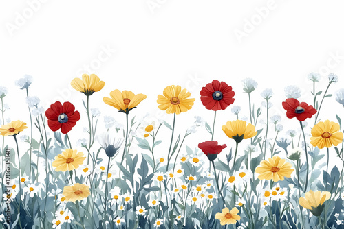 wildflower, meadow, border, floral, design, spring, flower, summer, nature, field, red, yellow, white, daisy, poppy, illustration, background, pattern, texture, seamless, watercolor, paint, art, graphic, image, vector, digital, print, card, invitation, website, banner, template, decoration, element, botanical, bloom, blossom, greenery, vibrant, colourful, beauty, landscape, garden
