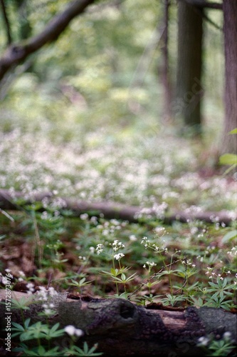 fallen tree, forest floor, blurred background, depth of field, wildflower, fore