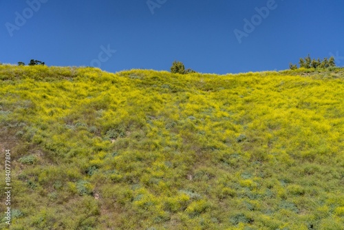 Wildflowers on the hillside in April. La Conchita, Ventura County, California. Red Mountain(Santa Ynez Mountains). coastal terrace. U.S. Route 101, or U.S. Highway 101 (US 101)