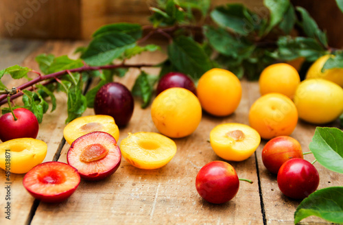 tree, mirabelle plum, game, plum, fruit, wilde, yellow, red, aged, kind, fruit, fruit, distinct, table, board, forest, white, overhead, from, up, nuclear, kernel, fresh, crop, wave, stripes, background