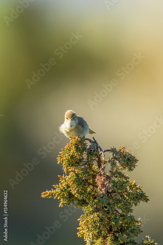 Willow warbler sitting on a juniper twig
