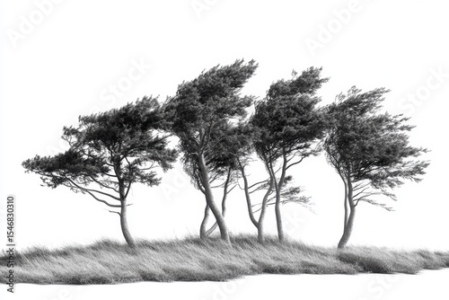Wind swept trees standing resilient against a stark white background in a tranquil landscape, Trees In The Wind Cut Out With Alpha Channel