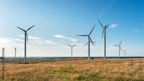 Wind farm on the Baltic Sea. Ecological electricity generation. Windmills against the blue sky. The Baltic Sea in the distance. Birds flying between windmills.
